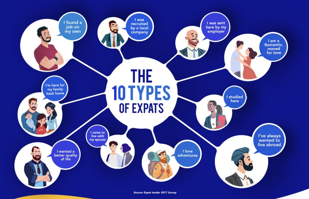 Expats can be classified into different groups based on their purpose and lifestyle: